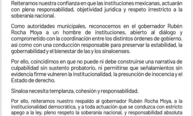 Finalmente, las autoridades municipales coincidieron en que Sinaloa requiere templanza, cohesión y responsabilidad política, por lo que reiteraron su respaldo al gobernador, a la institucionalidad democrática y a toda actuación que se conduzca con apego a la ley y respeto a la soberanía nacional.