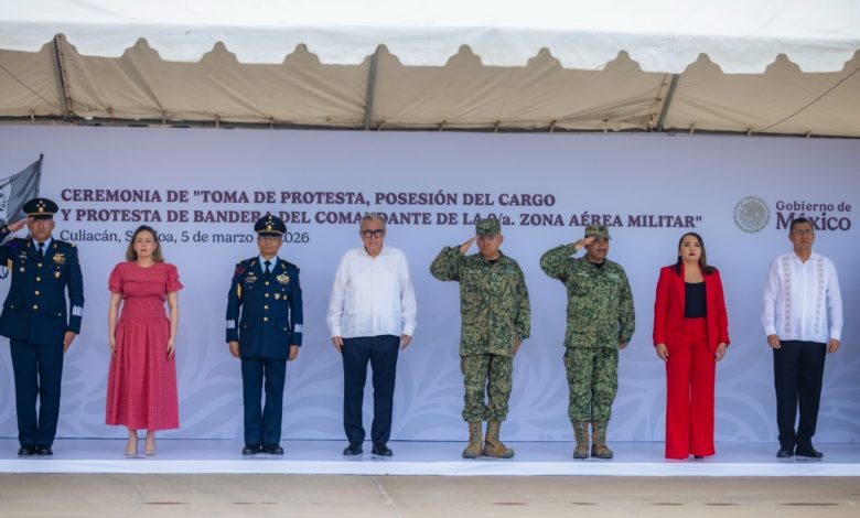 Culiacán, Sinaloa, a 5 de marzo de 2026.- El gobernador Rubén Rocha Moya asistió a la ceremonia donde el general de Ala Piloto Aviador, Edgar Emanuel Campos Martínez, asumió la comandancia de la recién creada Novena Zona Aérea Militar, cuya sede será la Base Aérea Militar No. 10, de la cual ya era el comandante, cambio que obedece a la aplicación la Ley de Protección del Espacio Aéreo Mexicano.