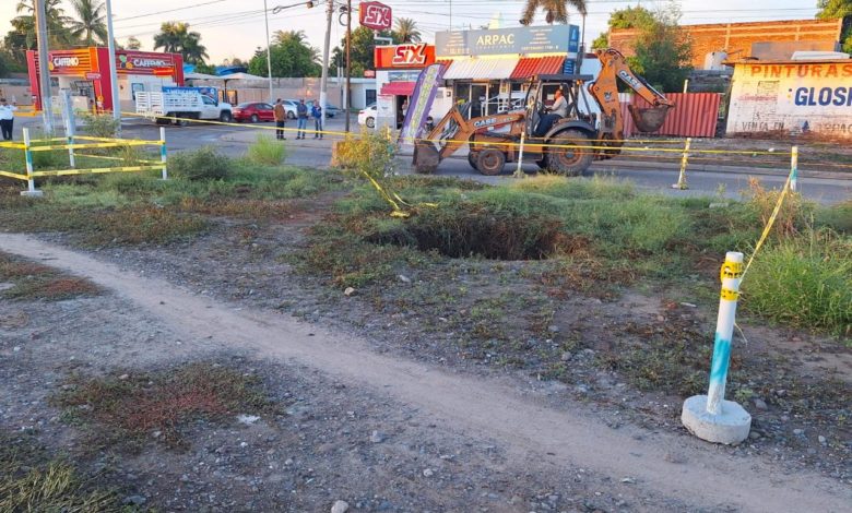 Los Mochis Sinaloa, lunes 13 de octubre de 2025.- Esta tarde se detectó un socavón en los puntos Bulevar Centenario y Niños Héroes, por lo que autoridades municipales acudieron para delimitar y controlar dicha emergencia.