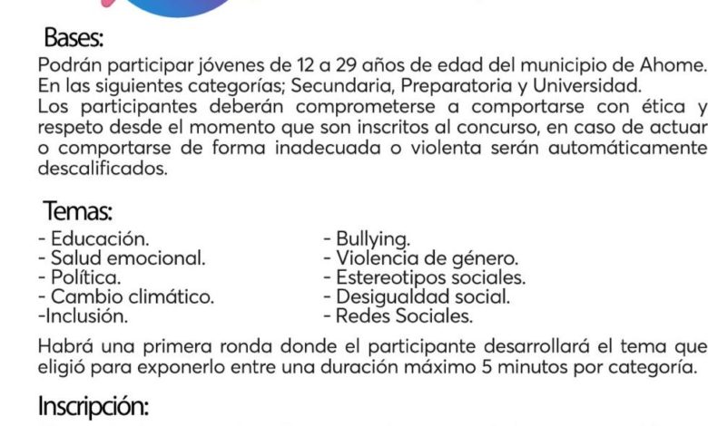 La convocatoria establece que podrán participar jóvenes de 12 a 29 años de edad del municipio de Ahome, en tres categorías: Secundaria, Preparatoria y Universidad. Los temas a desarrollar son Educación, Salud emocional, Política, Cambio climático, Inclusión, Bullying, Violencia de género, Estereotipos sociales, Desigualdad social y Redes sociales.