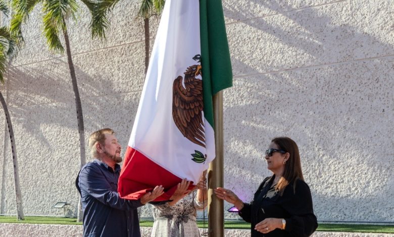 El oficial mayor, José Humberto Gálvez, en representación de la presidenta municipal, la Dra. Cecilia Ramírez Montoya, encabezó el izamiento en la explanada del Auditorio Héroes de Sinaloa, junto con la directora general de Educación y la presidenta de DIF Guasave, Ana Luisa León Perea, con apoyo de la escolta de la Secretaría de Seguridad Ciudadana y Movilidad Sustentable.