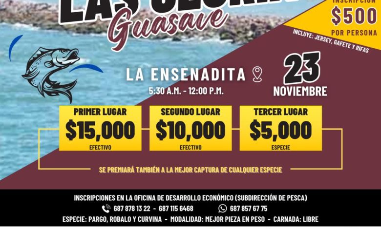 El primer lugar se llevará 15 mil pesos en efectivo; el segundo lugar, 10 mil pesos y el tercer lugar, 5 mil pesos en especie, para capturas de pargo, robalo y curvina. Además de un premio especial al mejor ejemplar en peso, de cualquier especie. La pesca será con anzuelo y carnada libre, a partir de las 6:00 horas, hasta las 12:00 de mediodía.