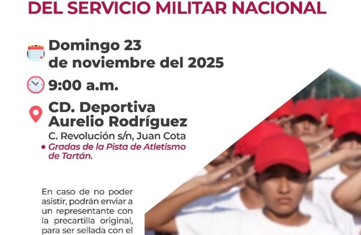 Los Mochis, Ahome, Sinaloa. A 19 de noviembre del 2025.- La Junta Municipal de Reclutamiento de Ahome, informa a los jóvenes de la Clase 2007 y remisos, que obtuvieron su Cartilla Militar (Precartilla) en el presente año, que deberán estar presentes el día domingo 23 de noviembre próximo, en el Sorteo Anual de los Jóvenes Conscriptos del Servicio Militar Nacional en la pista de tartán de la ciudad deportiva Aurelio Rodríguez Ituarte de esta ciudad de Los Mochis.