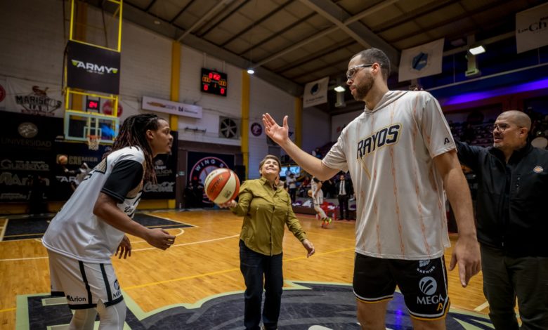 Guasave, Sin.- Por invitación del Club Frayles de Guasave, la presidenta municipal, la Dra. Cecilia Ramírez Montoya, lanzó la primera bola al aire (jump ball), en la inauguración de la Temporada 2026 del CIBACOPA, en el gimnasio Luis Estrada Medina.