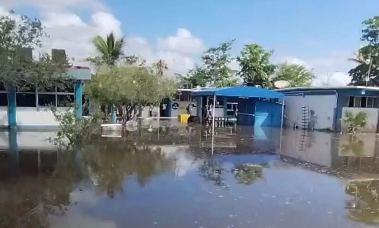 En el caso de Topolobampo, el mar reclamó su territorio inundando la preparatoria CETMAR, así como el barrio que lleva el mismo nombre, el nivel del agua alcanzó arropar las áreas verdes, el estacionamiento e incluso al interior de los mismos salones, desconociendo si hubo afectaciones o no.