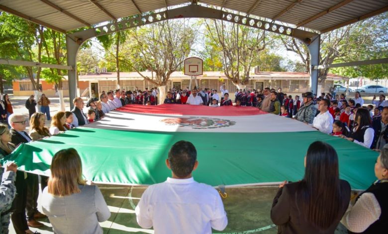 Los Mochis, Ahome, Sinaloa. A 23 de febrero de 2026.- Con las manos formando una casa y la voz firme, las niñas y los niños, guiados por las palabras de Alexa Jazmín, dijeron al unísono: “Ahome, la casa de Todos”. Así arrancó el Homenaje Cívico por el Día de la Bandera, realizado este lunes en la Escuela Primaria Ángel Flores, del ejido 20 de Noviembre Nuevo, como parte de la Brigada Educativa Municipal en coordinación con las Jornadas de la Paz.