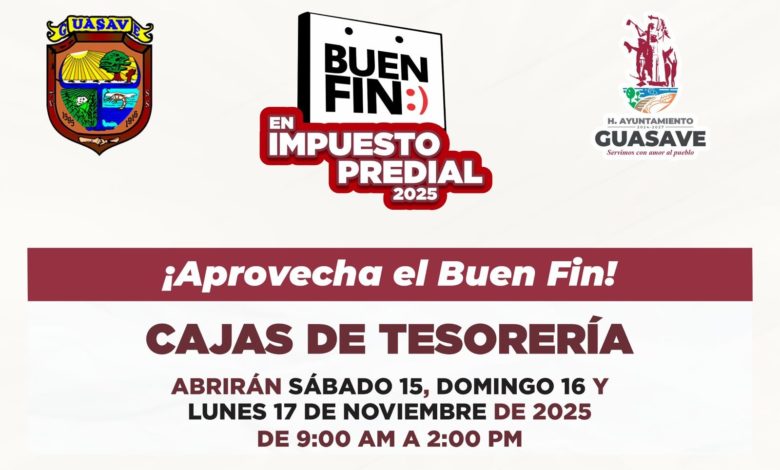 Guasave, Sin.- Las cajas de la Tesorería Municipal estarán abiertas por el Buen Fin este sábado 15, domingo 16 y lunes 17 de noviembre, con el fin de que los contribuyentes aprovechen los descuentos en el predial urbano y multas de tránsito.