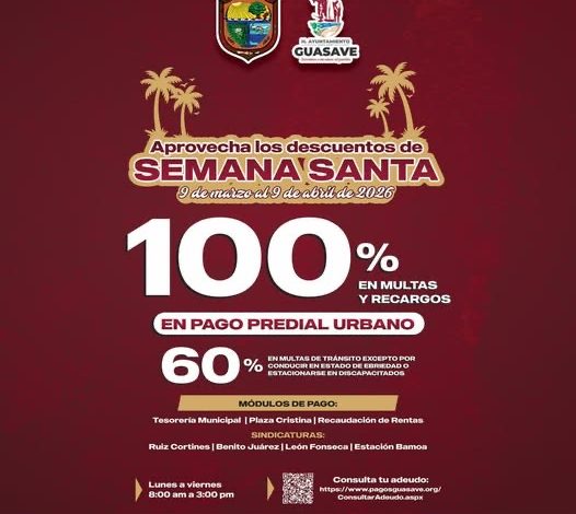 Tesorería de Guasave anuncia horarios de cajas y descuentos por Semana Santa