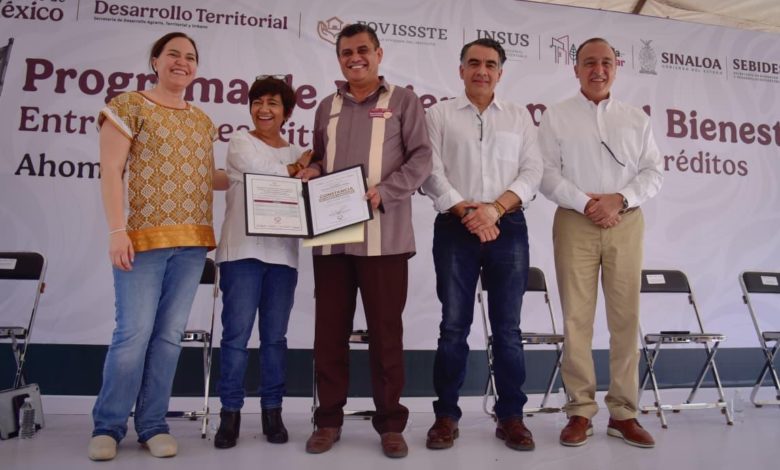 Los Mochis, Ahome, Sinaloa. A 28 de Marzo de 2026.- 405 familias ahomenses de la colonia Ferrocarrilera que carecían de certeza jurídica por asentarse en lotes irregulares recibieron sus escrituras públicas de parte del Instituto Nacional del Suelo Sustentable (INSUS), y 133 más se beneficiaron con la constancia de liquidación de sus créditos del Fondo de la Vivienda del Instituto de Seguridad y Servicios Sociales de los Trabajadores del Estado(FOVISSSTE).